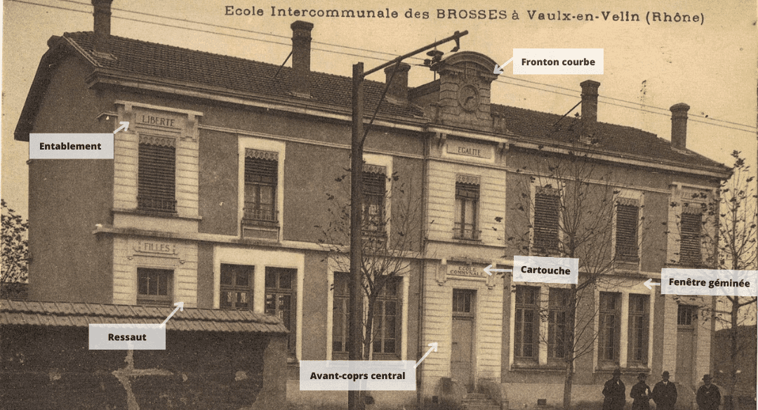 Après l’achat d’une parcelle à M. Chanat en 1910, l’école est construite à partir de 1912, elle s’implante parallèle à la route de Genas et elle se déploie sur deux niveaux. La façade principale sur rue est de composition classique, harmonieuse avec une recherche de symétrie dans son organisation. Le style architectural est riche.
