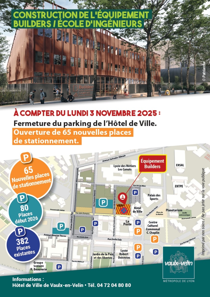À partir du lundi 3 novembre, les travaux de l’école d’ingénieurs Builders débutent derrière l’Hôtel de Ville, entrainant la fermeture du parking.