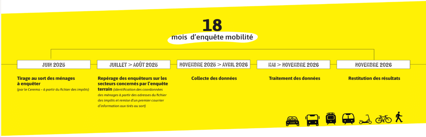 La participation des tirés au sort reste volontaire mais elle est essentielle pour mieux comprendre les pratiques et besoins en mobilité, et proposer les services les plus adaptés pour y répondre. Toutes les données collectées seront anonymisées, strictement confidentielles et traitées dans le respect du règlement général sur la protection des données personnelles. Les premiers résultats seront disponibles fin 2026, avec une publication complète au premier semestre 2027.