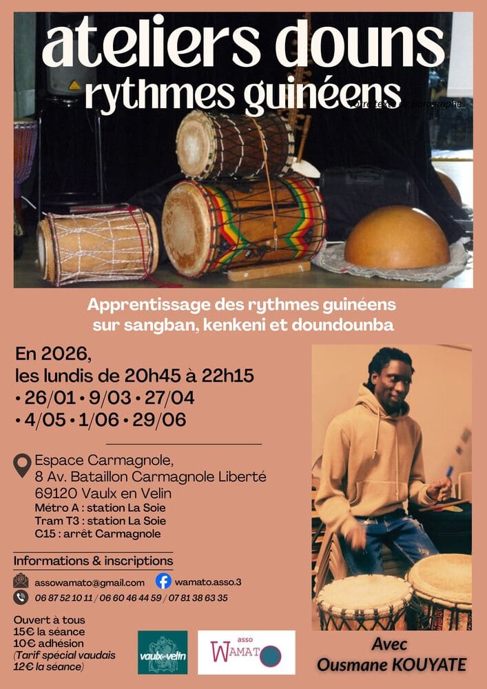 L’association Wamato organise des ateliers d’apprentissage des rythmes guinéens sur sangban, kenkeni et doundounba avec Ousmane Kouyate.
