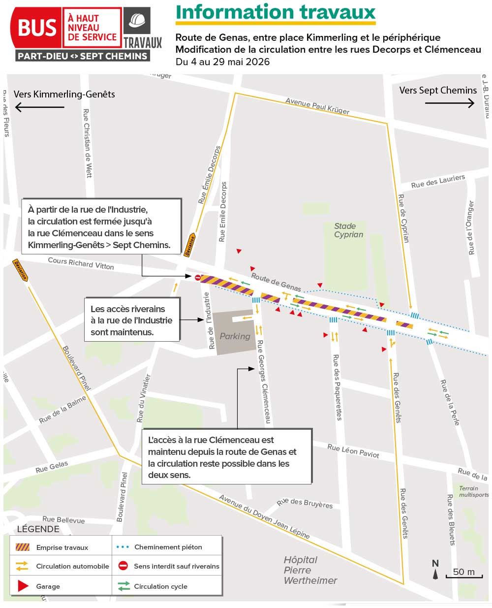 La route de Genas sera coupée dans le sens Kimmerling-Genêts vers Sept Chemins à partir de la rue de l’Industrie jusqu’à la rue Clémenceau. Des déviations seront mises en place ( voir le plan de circulation ci-contre ). Les accès riverains à la rue de l’Industrie seront maintenus. L’accès à la rue Clémenceau sera maintenu depuis la route de Genas et la circulation sera possible dans les deux sens.