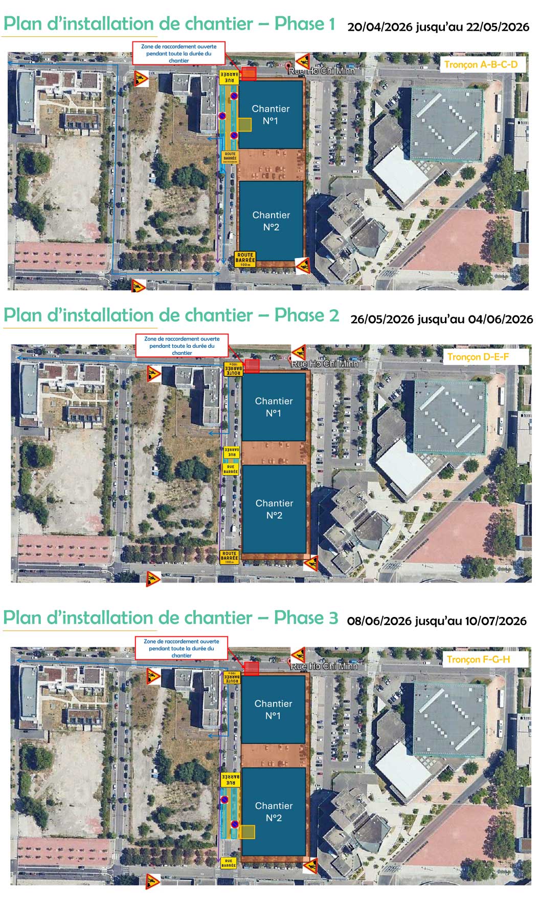 Les travaux d’aménagements urbains se poursuivent route de Genas jusque sous le périphérique, entre la rue du Maréchal Foch et la rue des Brosses. Des emprises travaux sont délimitées au centre de la chaussée. Les deux sens de circulation (Est > Ouest et Ouest > Est) sont maintenus.